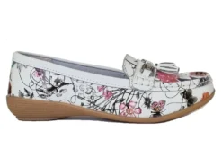 Womens Ladies Botanical White Floral Leather Wide Fit Comfort Tassel Loafers Flat Summer Shoes